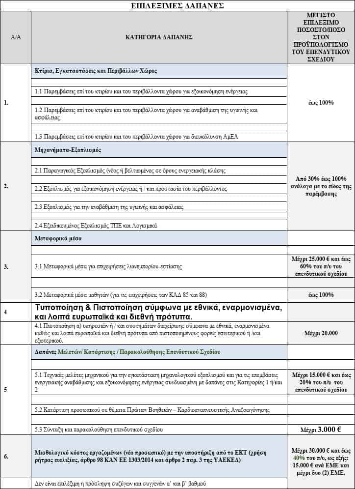Στις επιλέξιμες δαπάνες, μεταξύ άλλων, περιλαμβάνονται:
